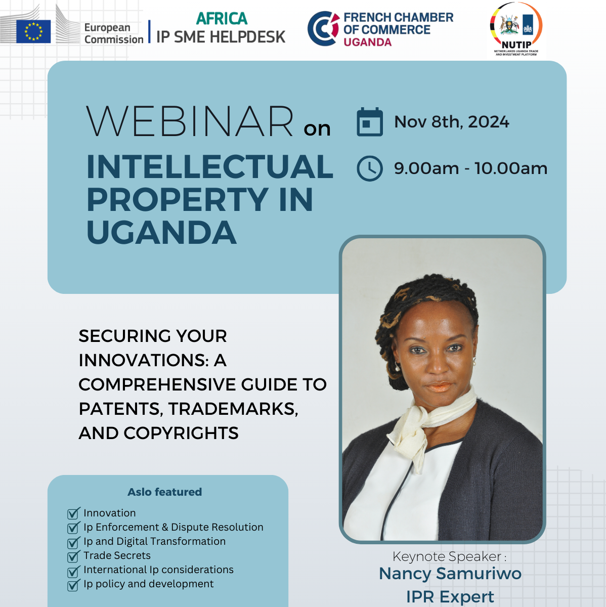 Dans le cadre d’une initiative collaborative, le European IP SME Help Desk s’est associé à la Chambre de Commerce Française en Ouganda (FCCU) et à la Netherlands Uganda Trade and Investment Platform (NUTIP) pour organiser un webinaire instructif sur les droits de propriété intellectuelle. Animée par la conférencière principale Nancy Samuriwo, experte reconnue en droits de propriété intellectuelle, cette session a offert aux membres des conseils complets pour naviguer dans les lois complexes sur la propriété. Le webinaire a fourni des informations précieuses sur la protection et la gestion de la propriété intellectuelle, dotant les entreprises des connaissances essentielles pour protéger leurs innovations et leurs actifs créatifs.