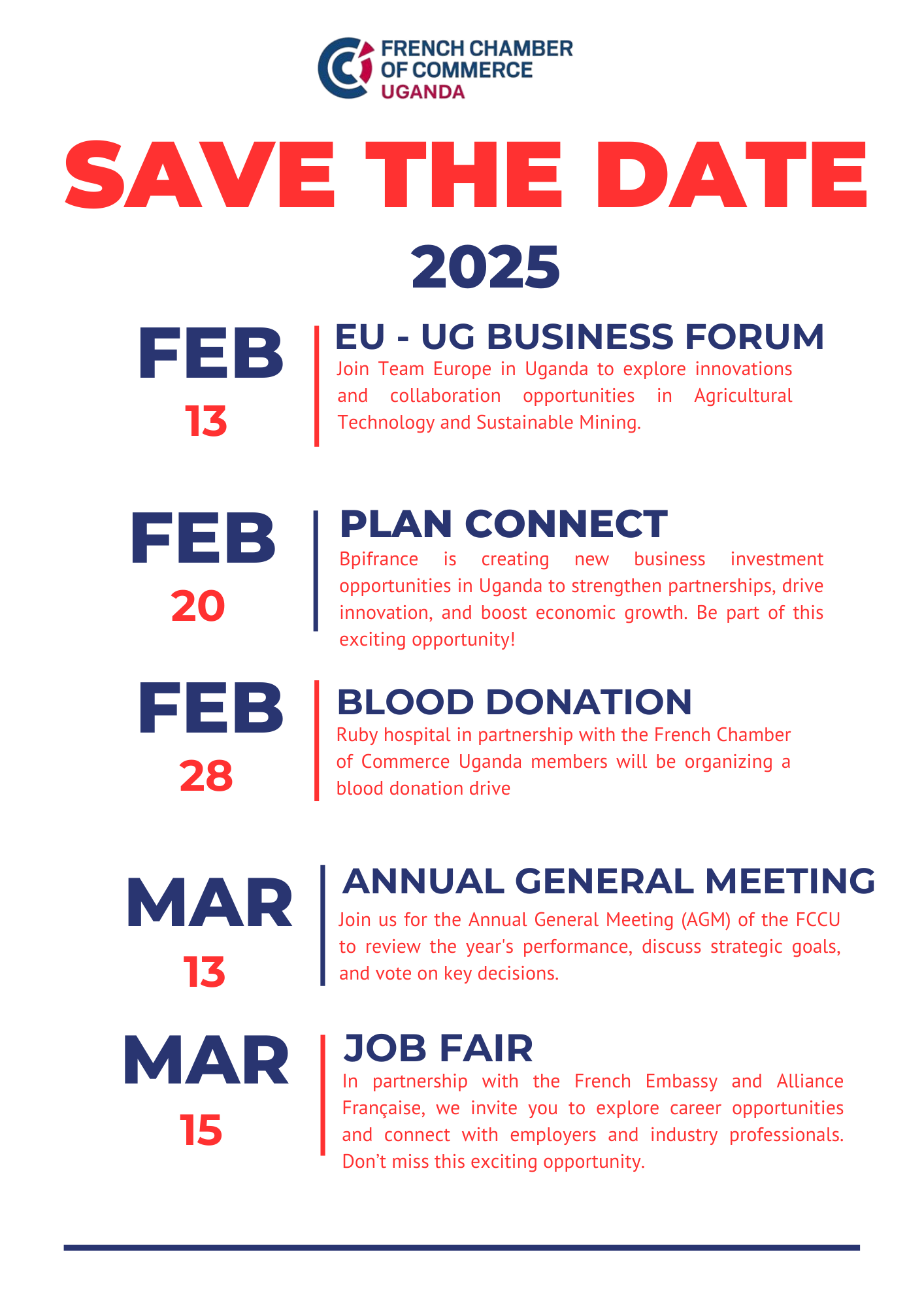 Des ateliers professionnels aux séances de réseautage, en passant par des événements culturels comme le Beaujolais Nouveau et la Semaine Française, nos rencontres offrent des occasions uniques de se connecter, d’apprendre et de grandir au sein de la communauté d’affaires franco-ougandaise.