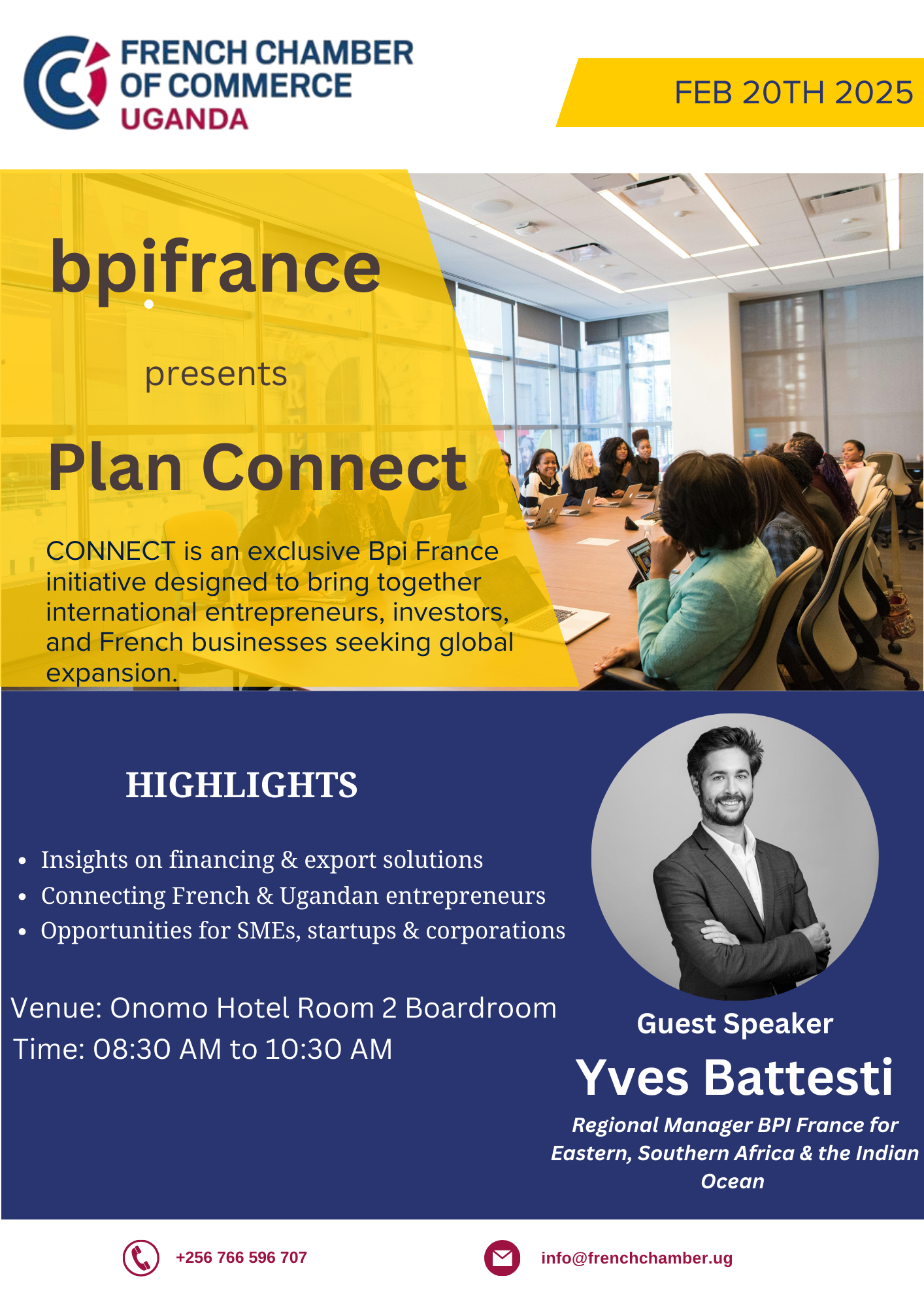 L’événement petit-déjeuner BPI France, prévu le 20 février 2025 à l’hôtel Onomo, réunira des entreprises à fort potentiel, des investisseurs et des acteurs clés pour explorer les opportunités de financement et favoriser des partenariats stratégiques. Animé par Yves Battesti, Directeur régional pour l’Afrique de l’Est, l’Afrique australe et l’océan Indien chez BPI France, cet événement offrira une plateforme aux entreprises pour échanger, partager des idées et présenter leurs projets d’expansion. Ce rassemblement exclusif vise à stimuler la croissance économique en facilitant l’accès aux investissements et en renforçant la collaboration entre les entreprises françaises et ougandaises.